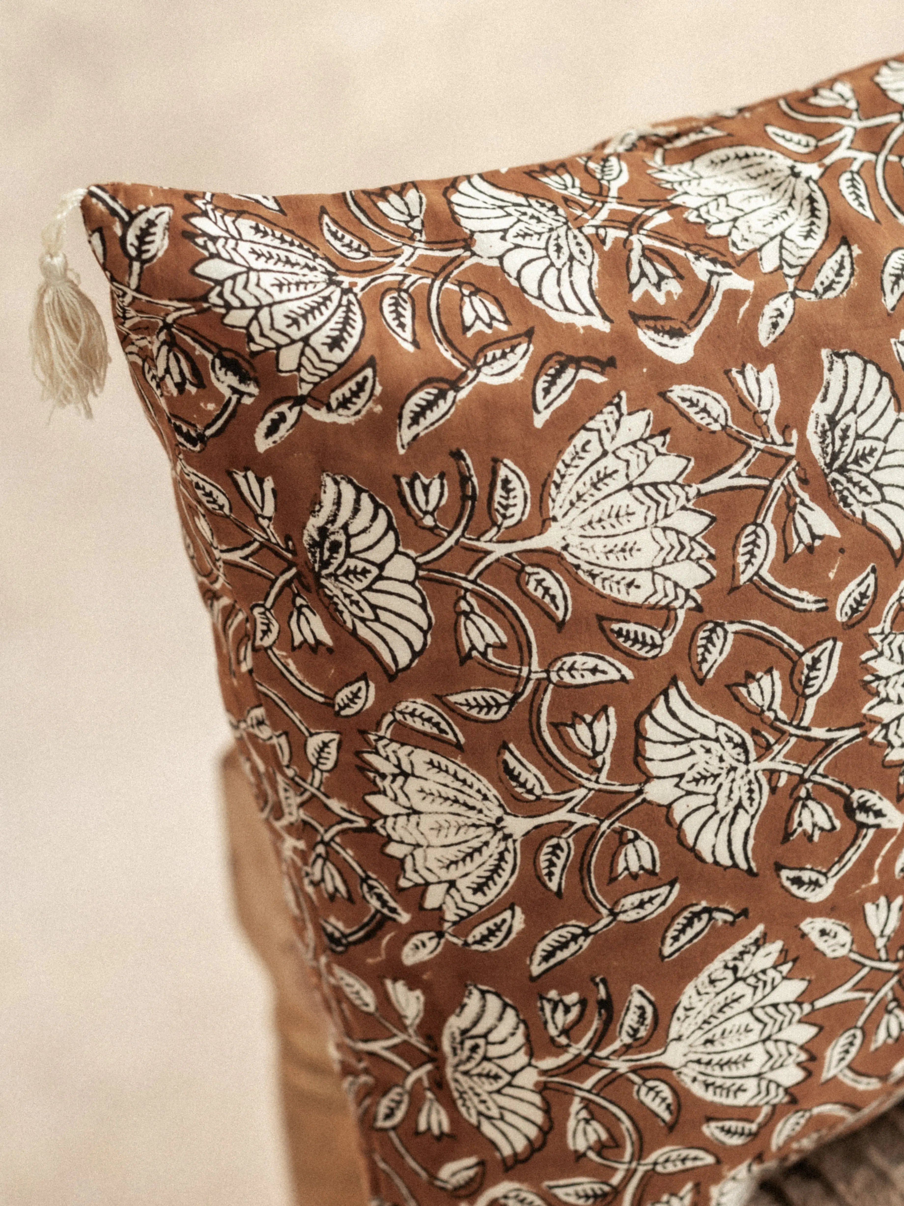 La touche florale contemporaine apporte une dimension poétique à ce textile blockprint, transformant simplement un espace de vie. La finition pompon écru ajoute une texture délicate et authentique, soulignant le travail méticuleux des artisans. La fermeture portefeuille élégante garantit à la fois praticité et raffinement.