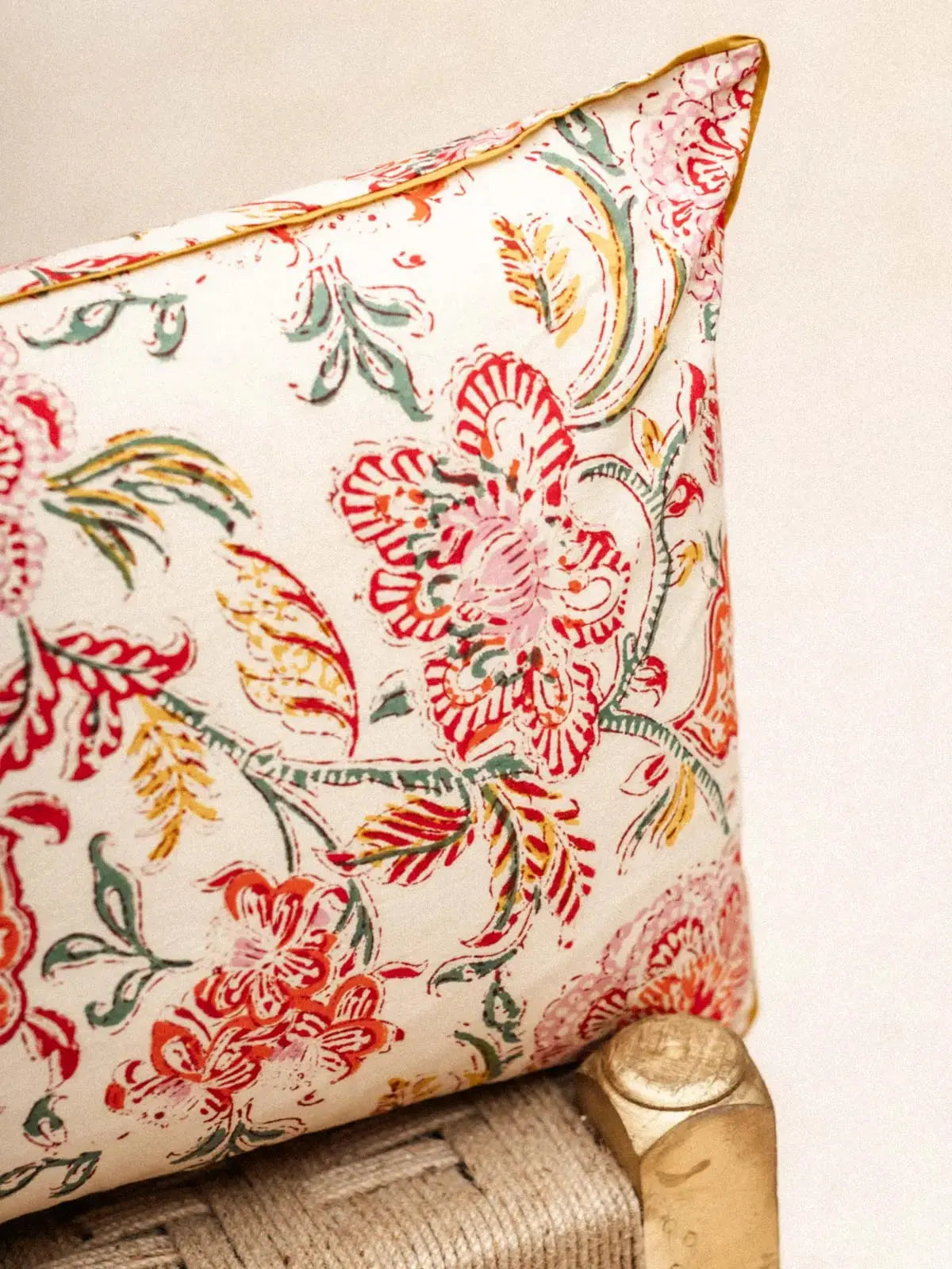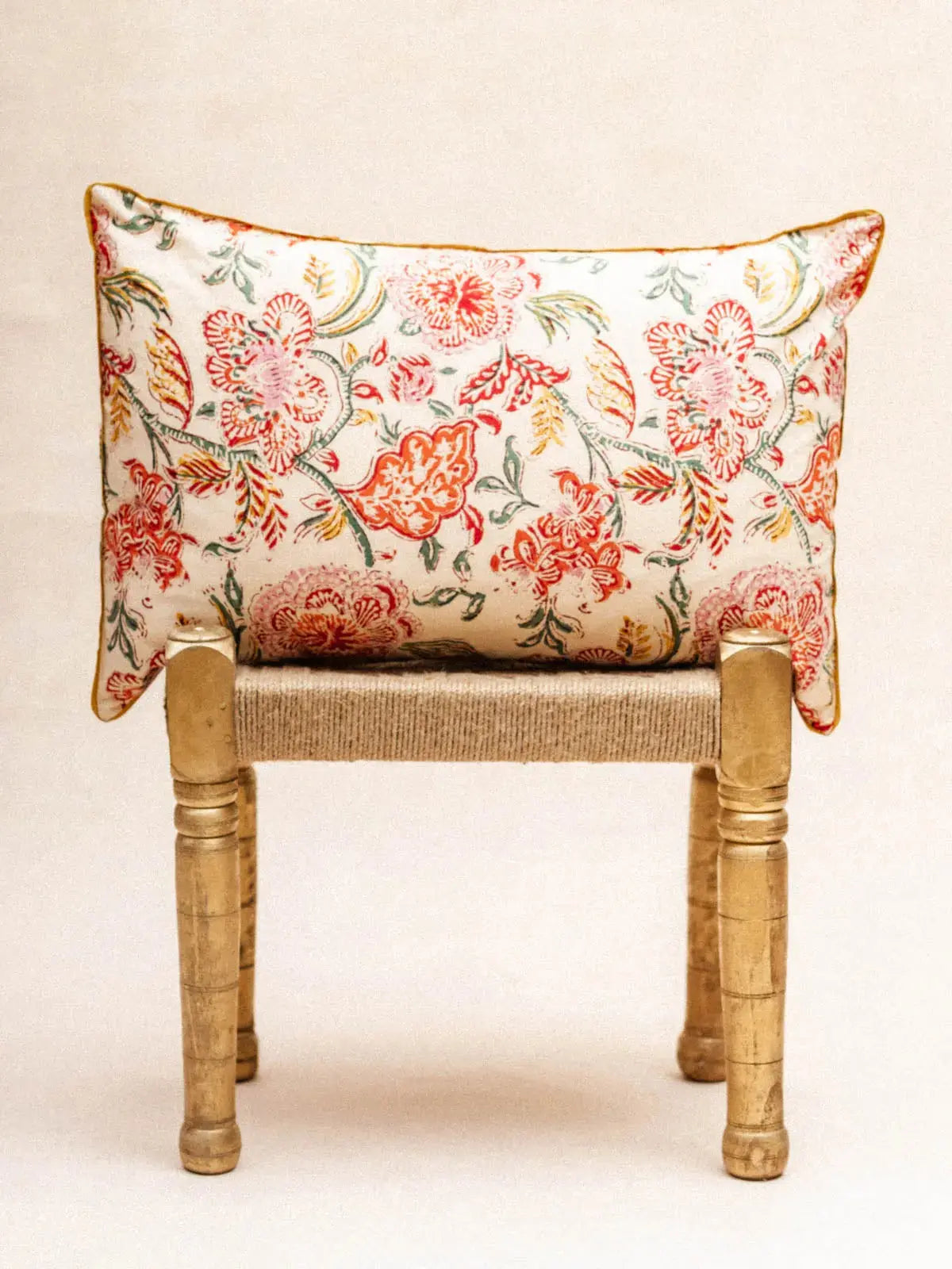 Confectionné en coton et imprimé à la main selon la technique du block-print, cette housse de coussin Neiroli revisite un motif floral traditionnel dans une version épurée et contemporaine.