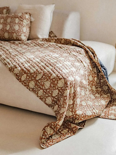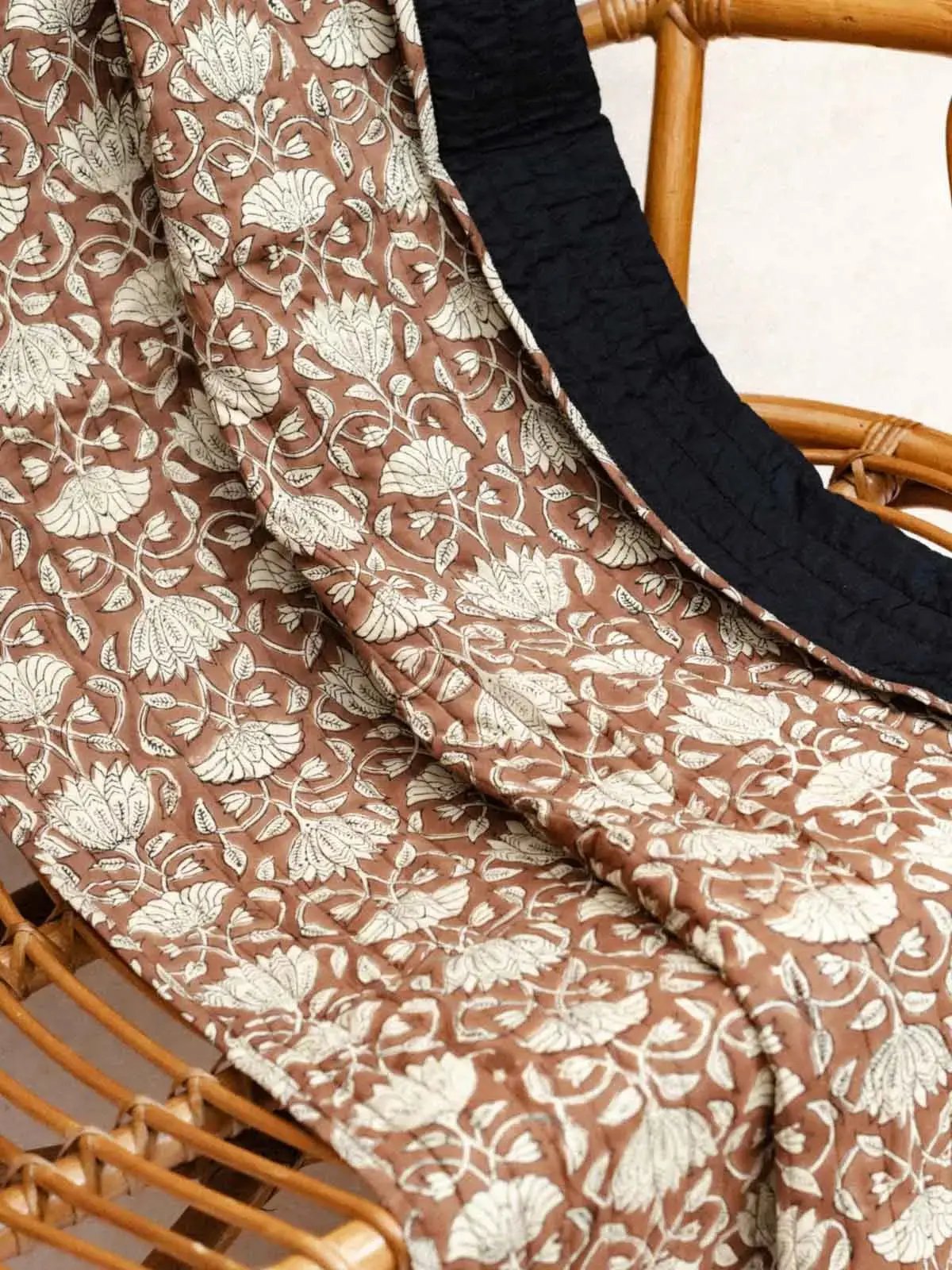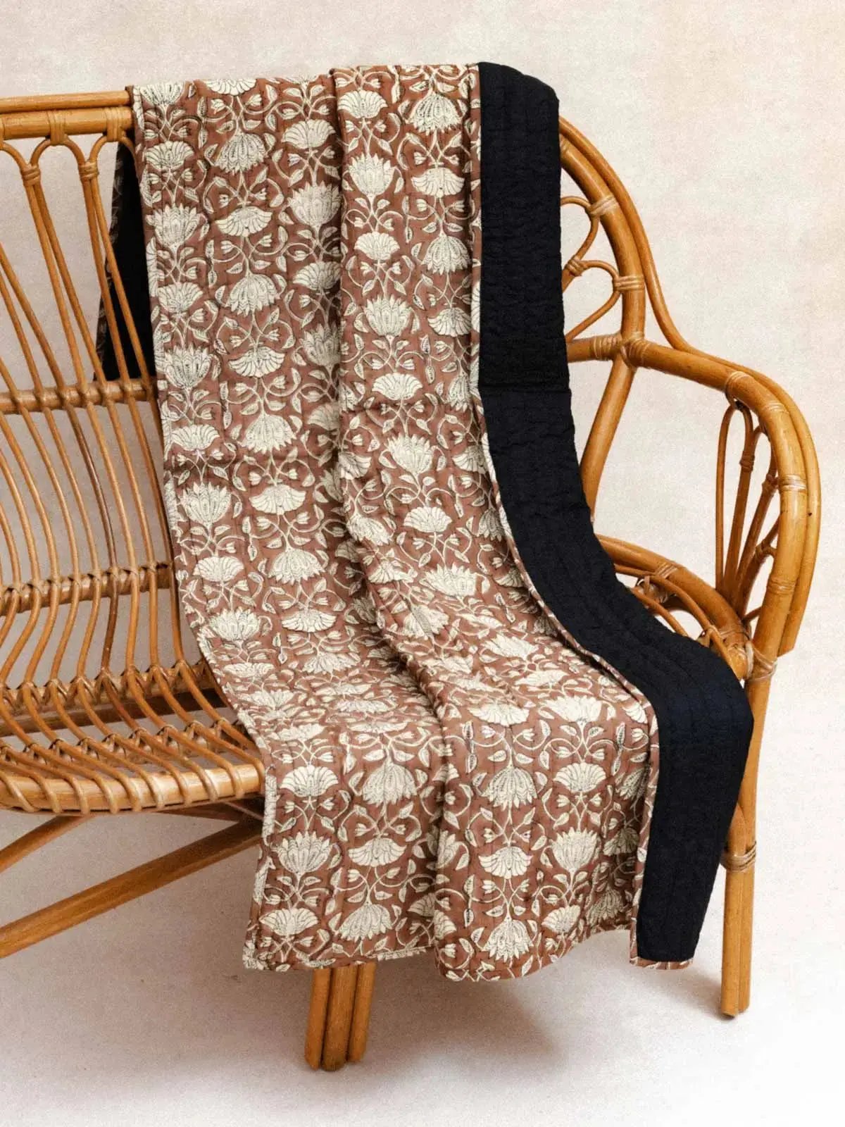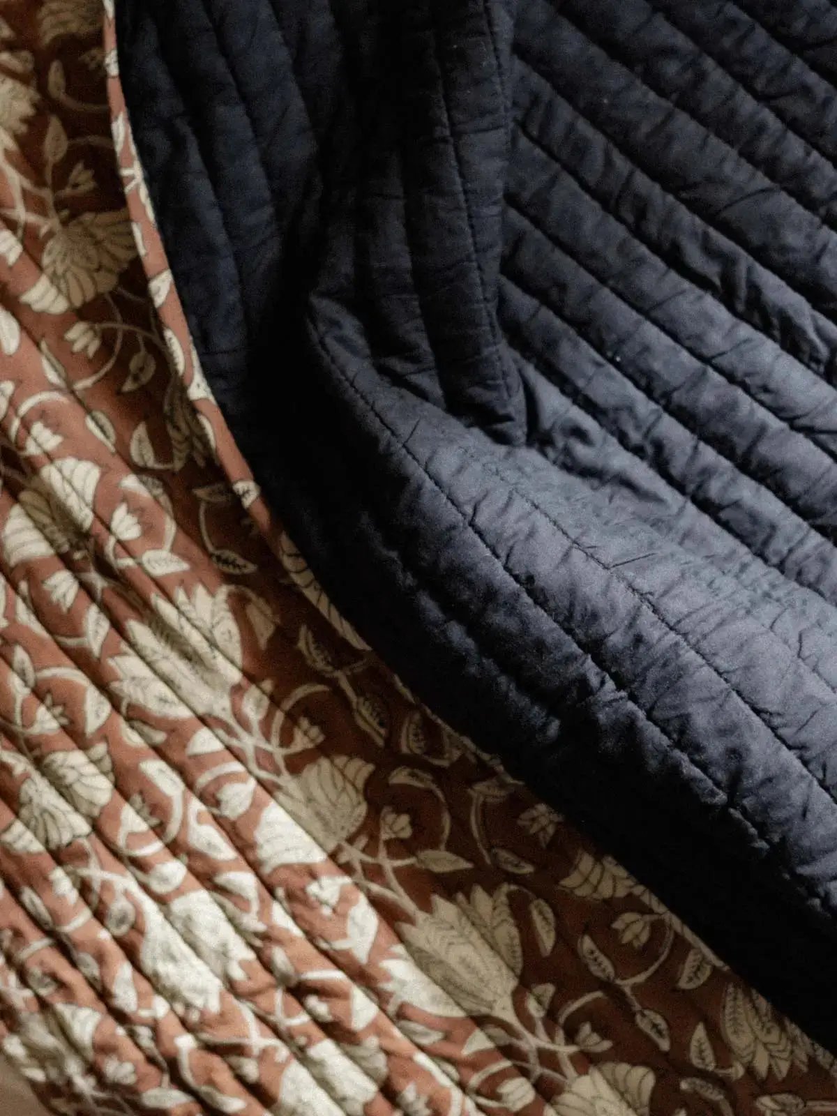 Ce plaid surpiqué artisanal indien allie la chaleur d'un tissu ouatiné au raffinement d'une double face unique : d'un côté, des motifs délicatement imprimés à la main selon la technique traditionnelle du block-print, de l'autre, un noir profond . Cette pièce textile d'exception, fruit d'un savoir-faire ancestral, apporte une touche d'élégance contemporaine à votre intérieur, que ce soit en jeté de lit ou en plaid de canapé.