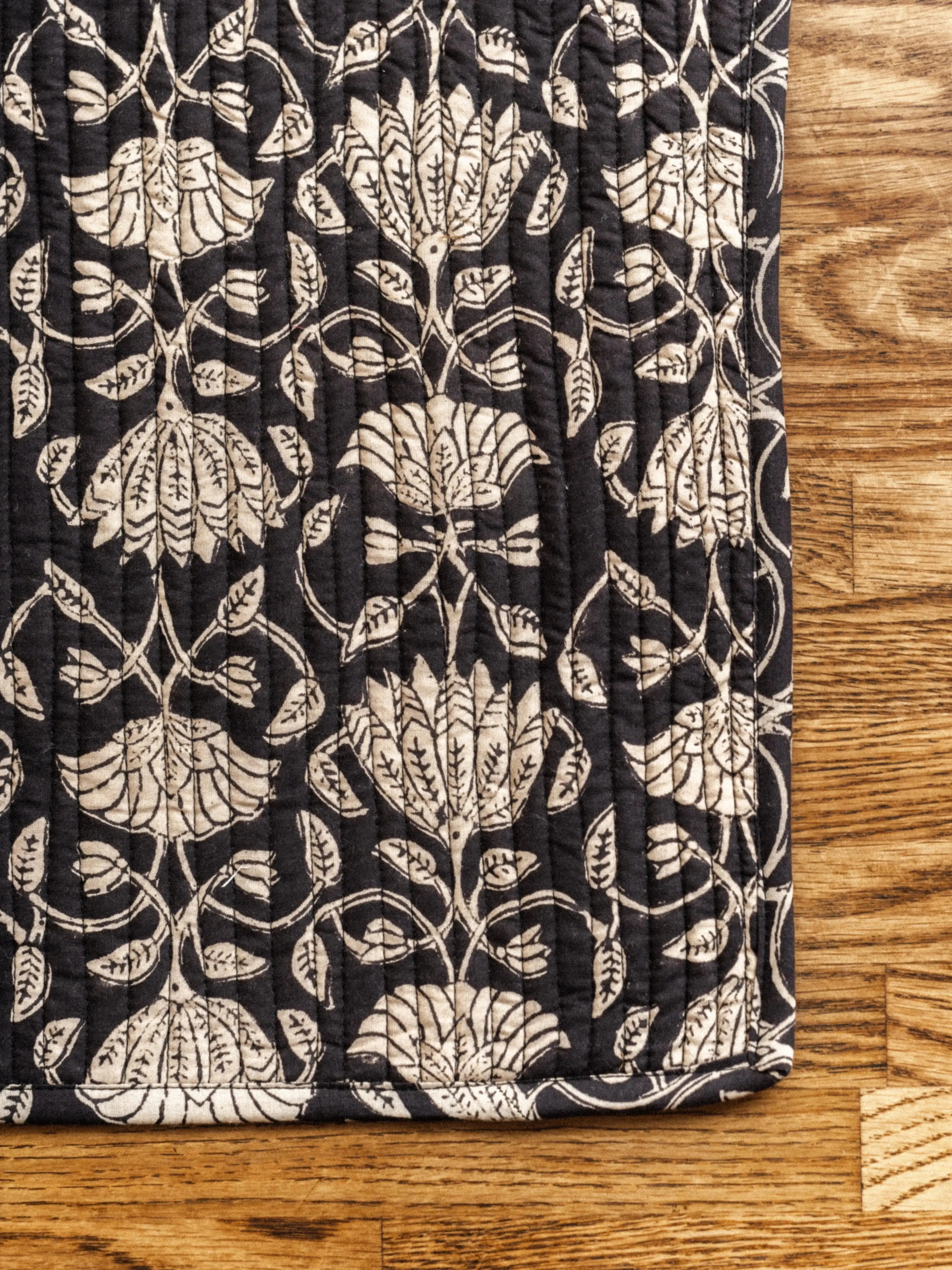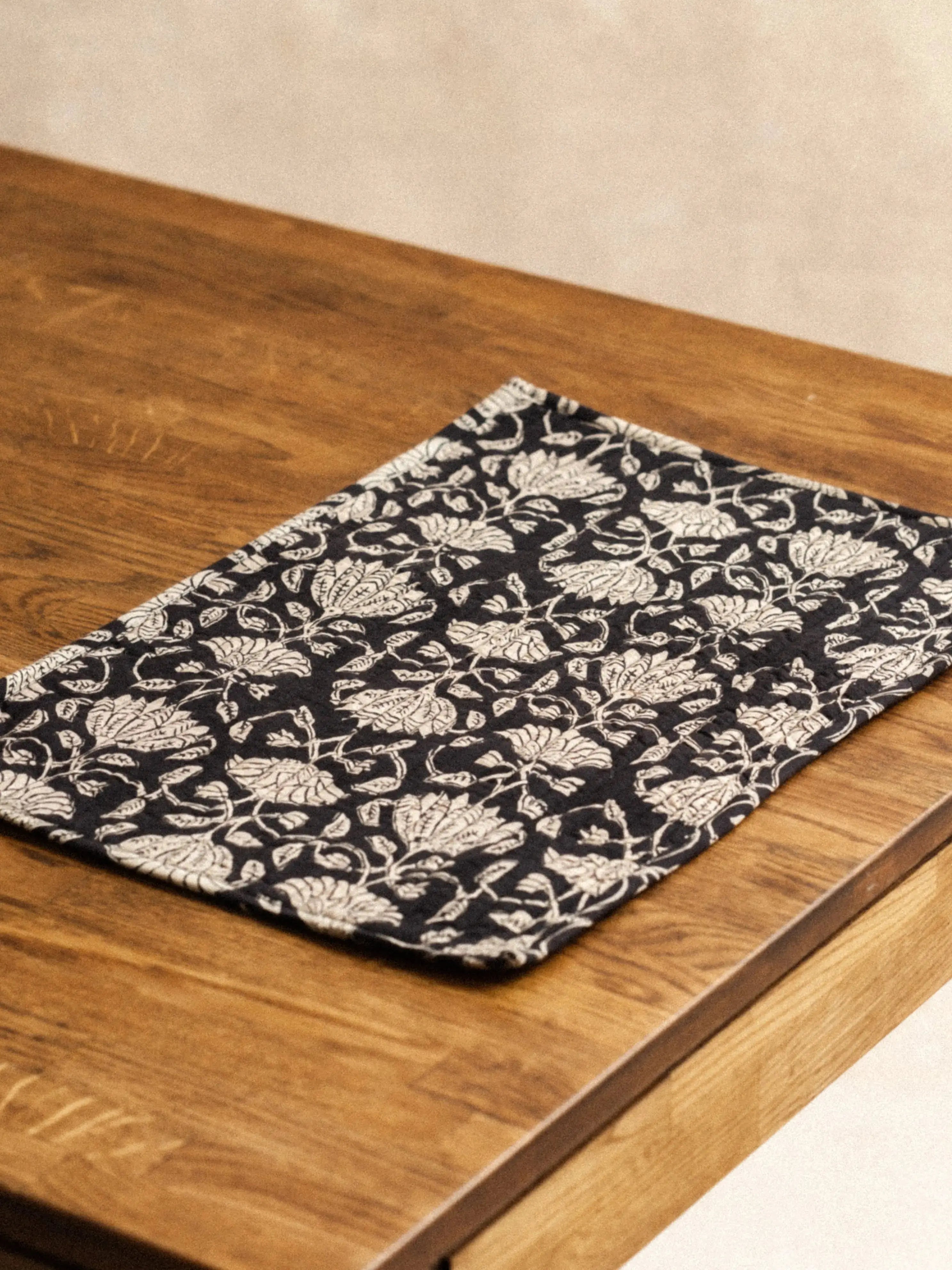 Set de table tissu surpiqué Lotus Noir | Block print indien & surpiqûres | Design Kirane