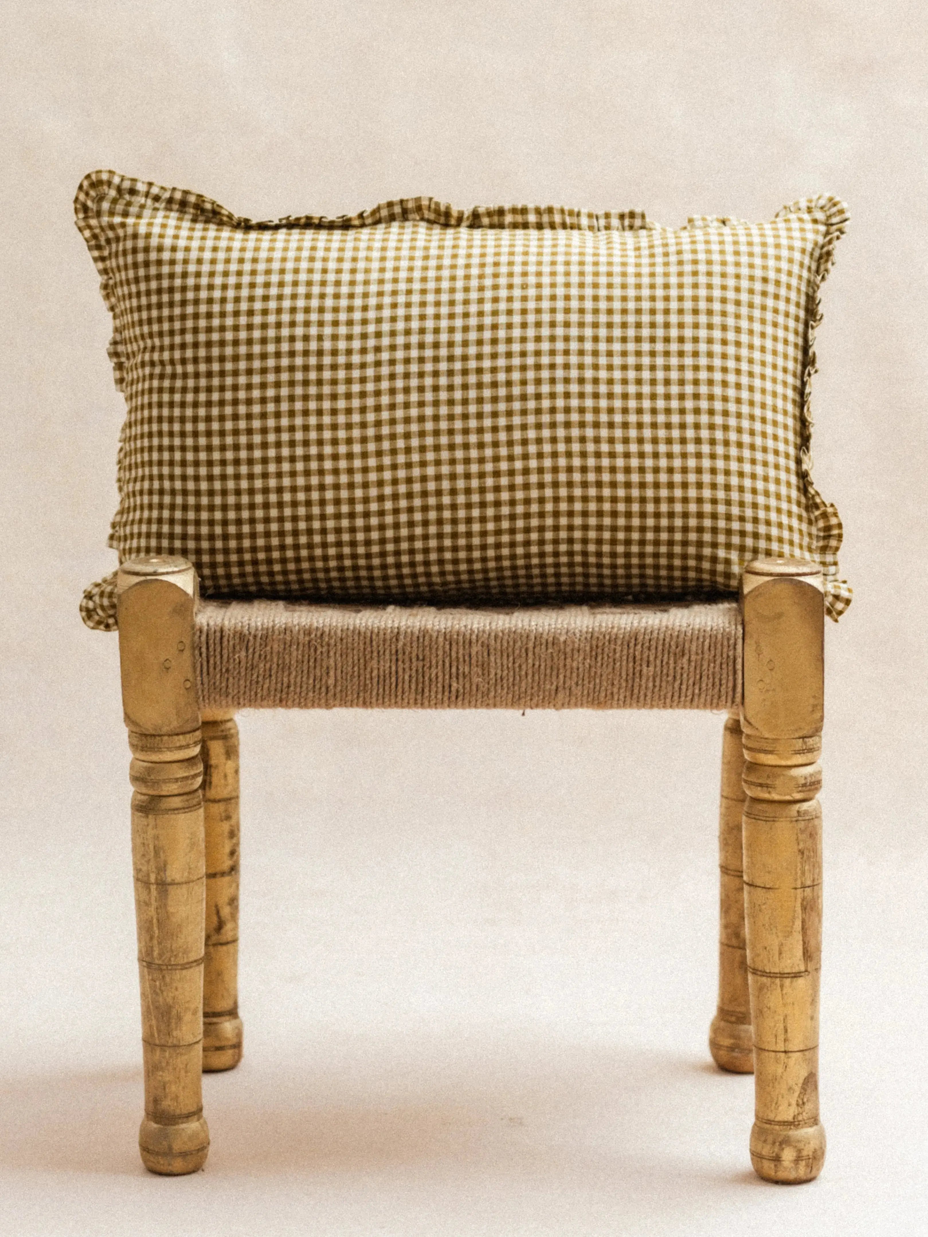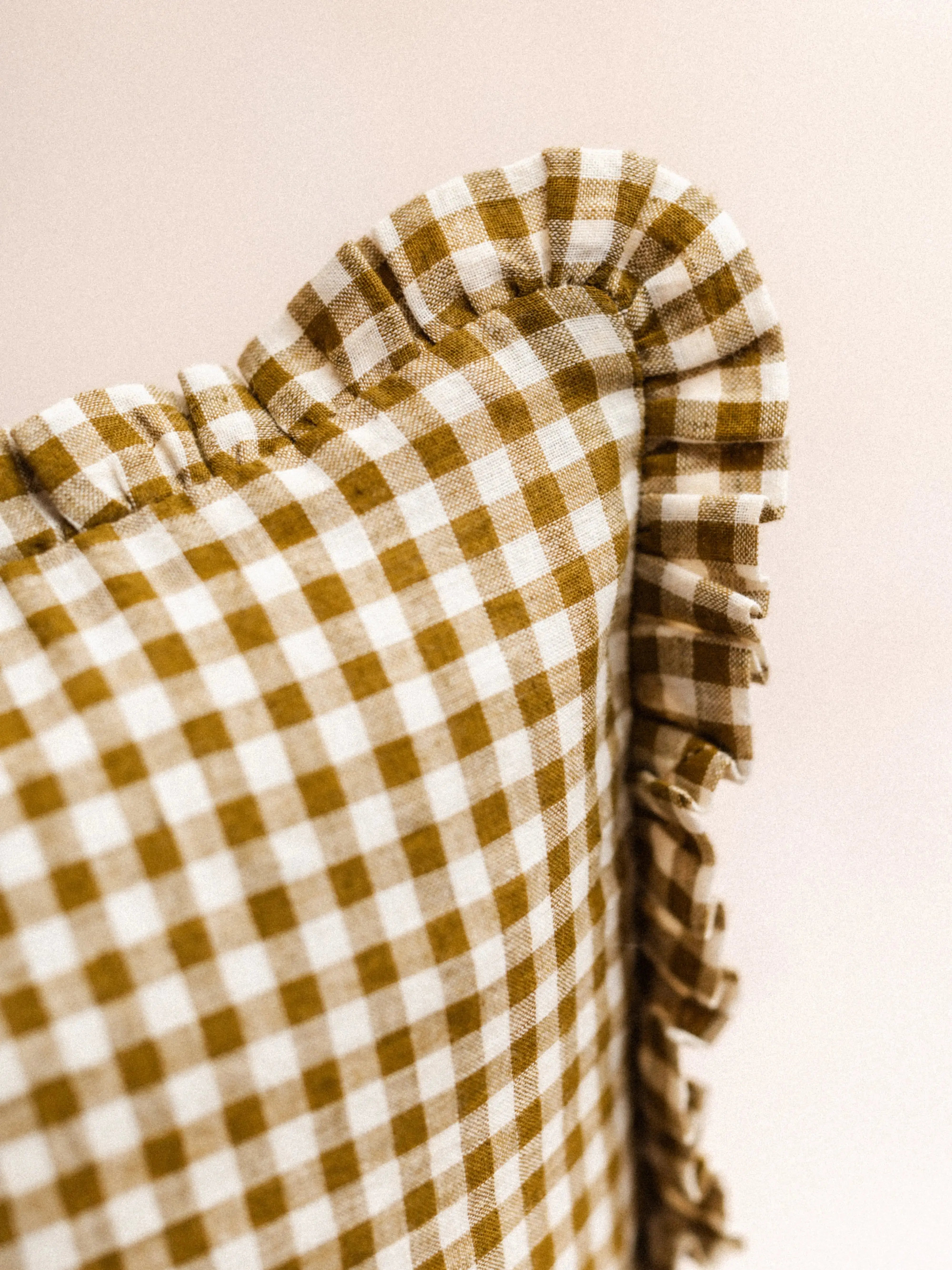 Découvrez la housse de coussin vichy café, tissée à la main avec sa jolie finition volantée. Cette création artisanale unique capture l'essence du style bohème chic avec joli carreaux vichy qui raconte des histoires de notre enfance. Chaque pièce est un témoignage de créativité et d'authenticité, parfaite pour sublimer votre intérieur.
