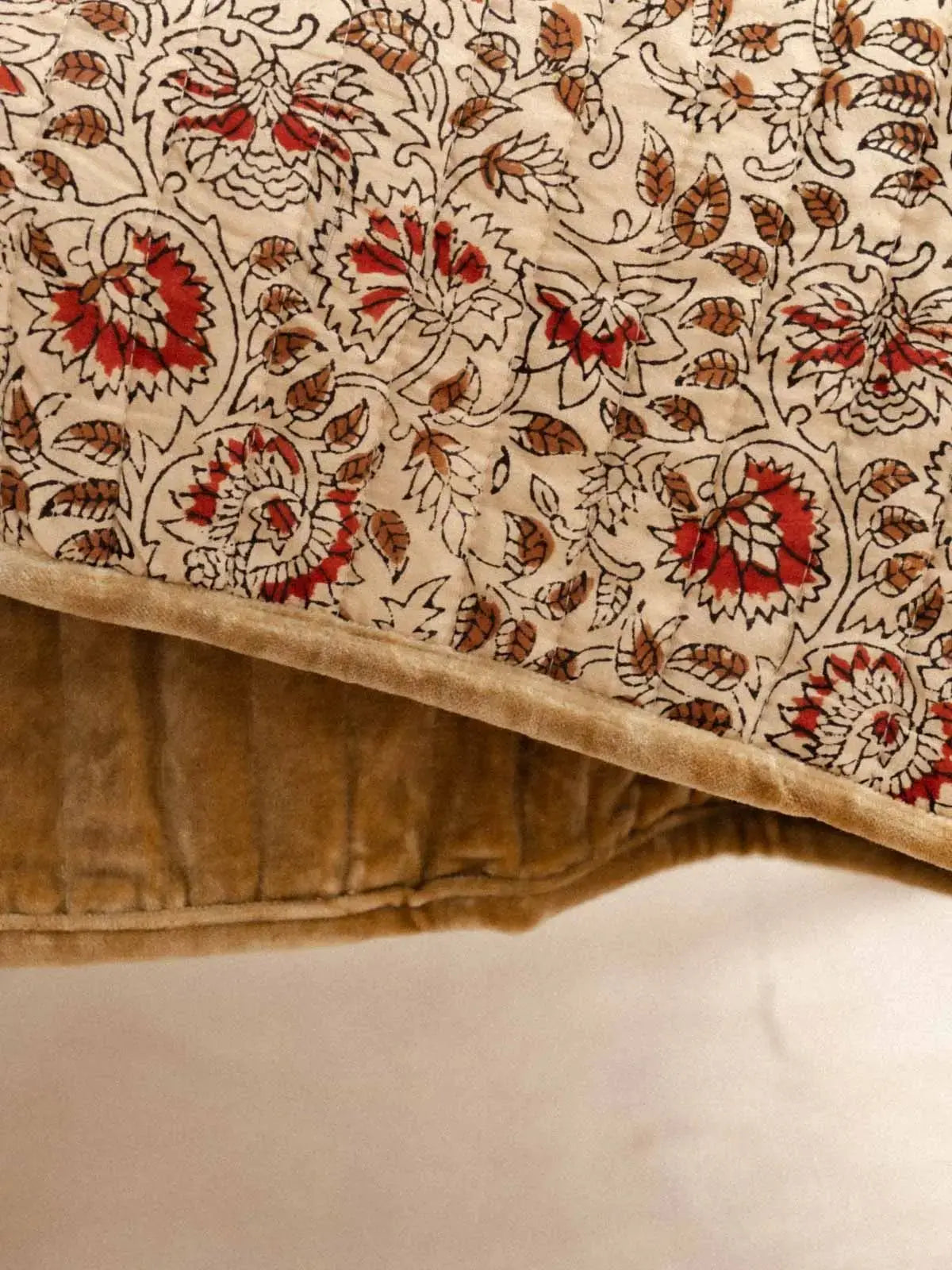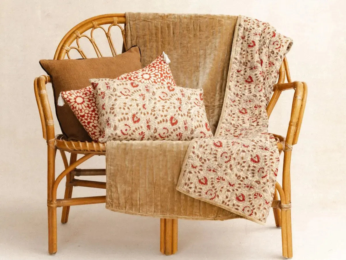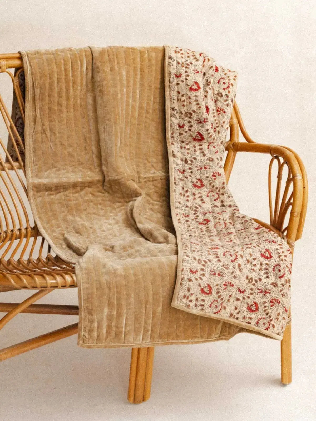 Ce plaid a une face en velours et une face en Block Print imprimée à la main. L’intérieur est rempli de ouatine pour plus de confort. Surpiqué à la main, chaque pièce est fabriquée avec soin dans notre atelier à Jaipur.