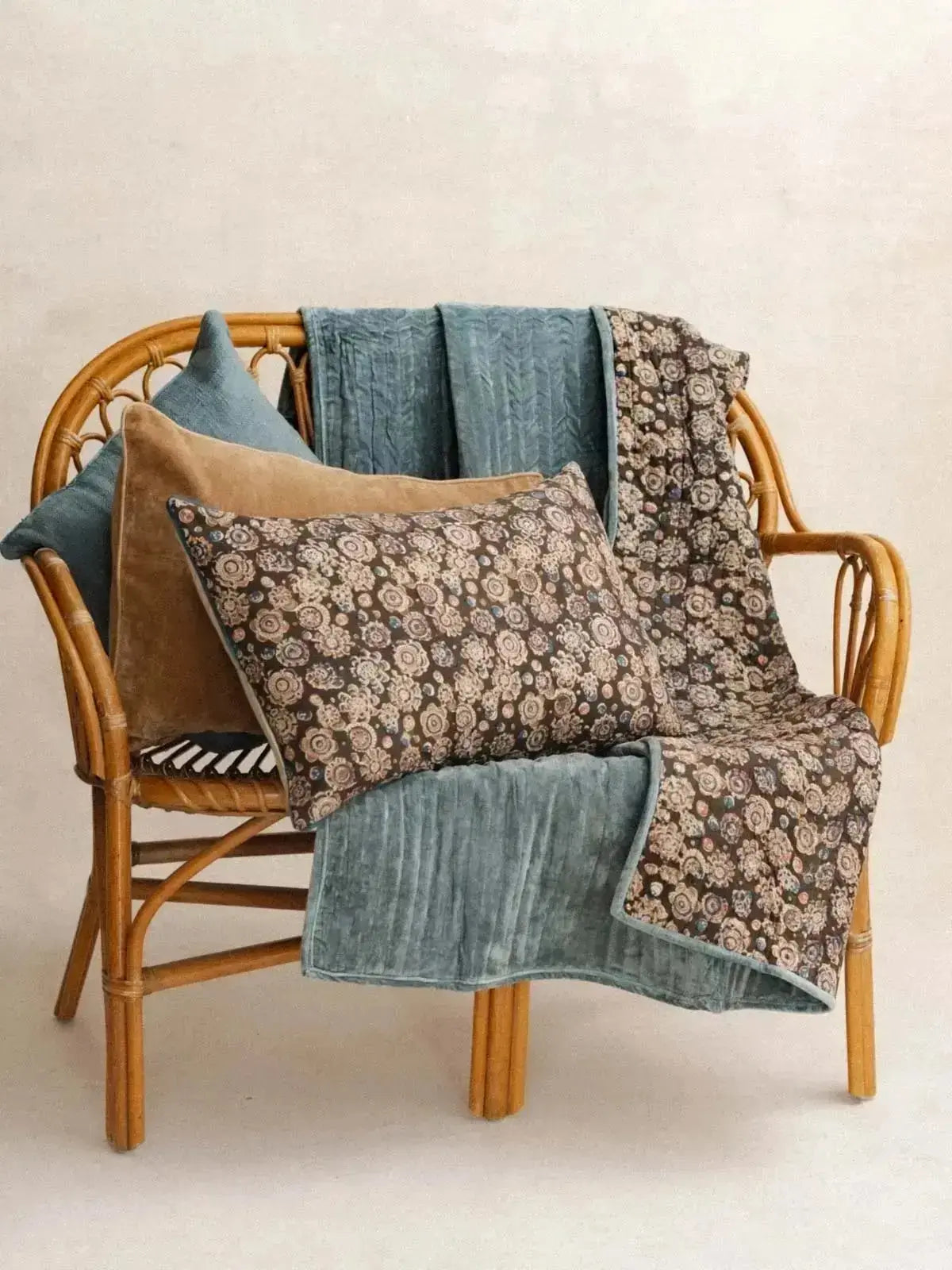 Ce plaid a une face en velours et une face en Block Print imprimée à la main. L’intérieur est rempli de ouatine pour plus de confort. Surpiqué à la main, chaque pièce est fabriquée avec soin dans notre atelier à Jaipur.