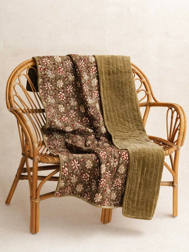 Ce plaid a une face en velours et une face en Block Print imprimée à la main. L’intérieur est rempli de ouatine pour plus de confort. Surpiqué à la main, chaque pièce est fabriquée avec soin dans notre atelier à Jaipur.