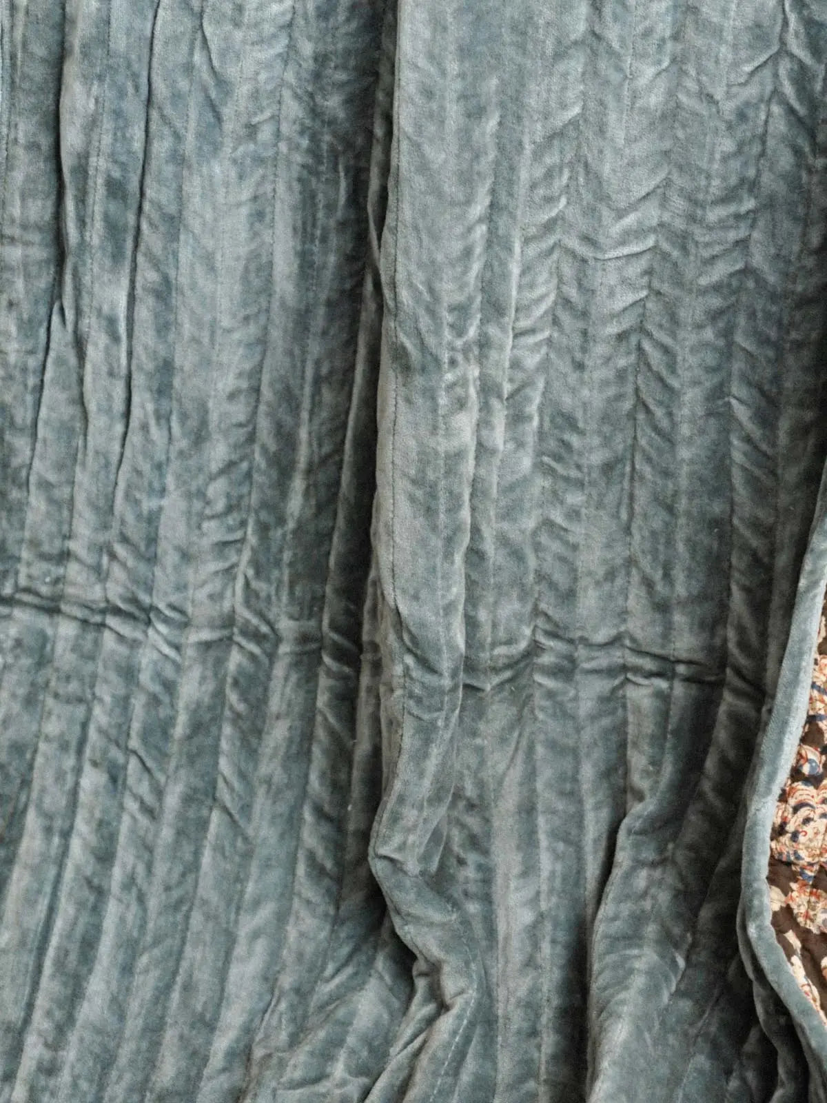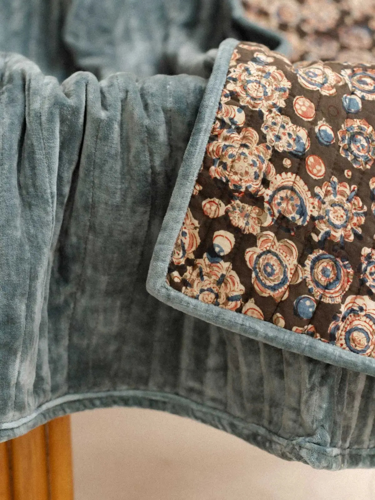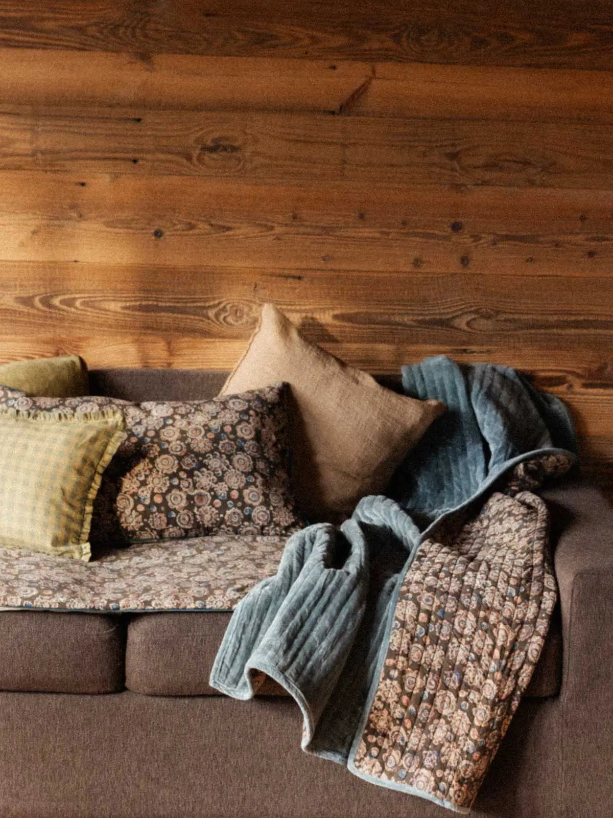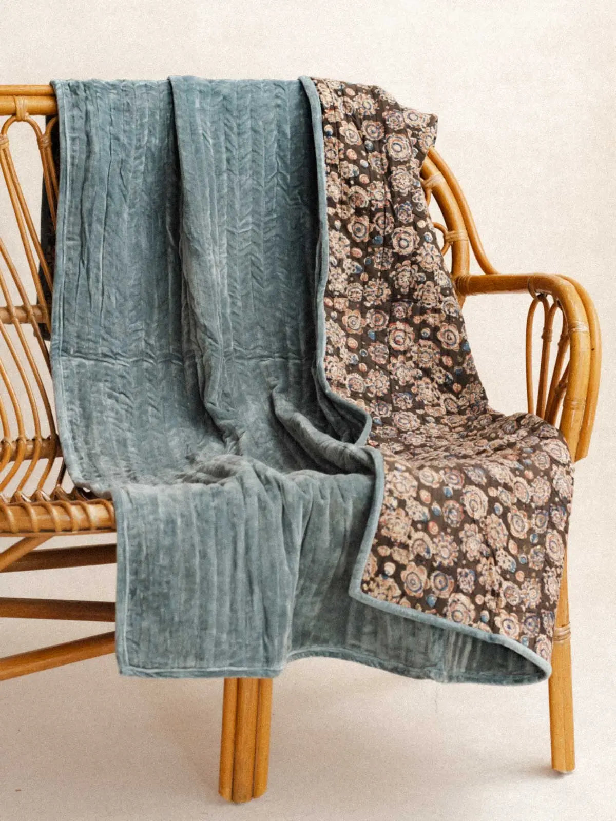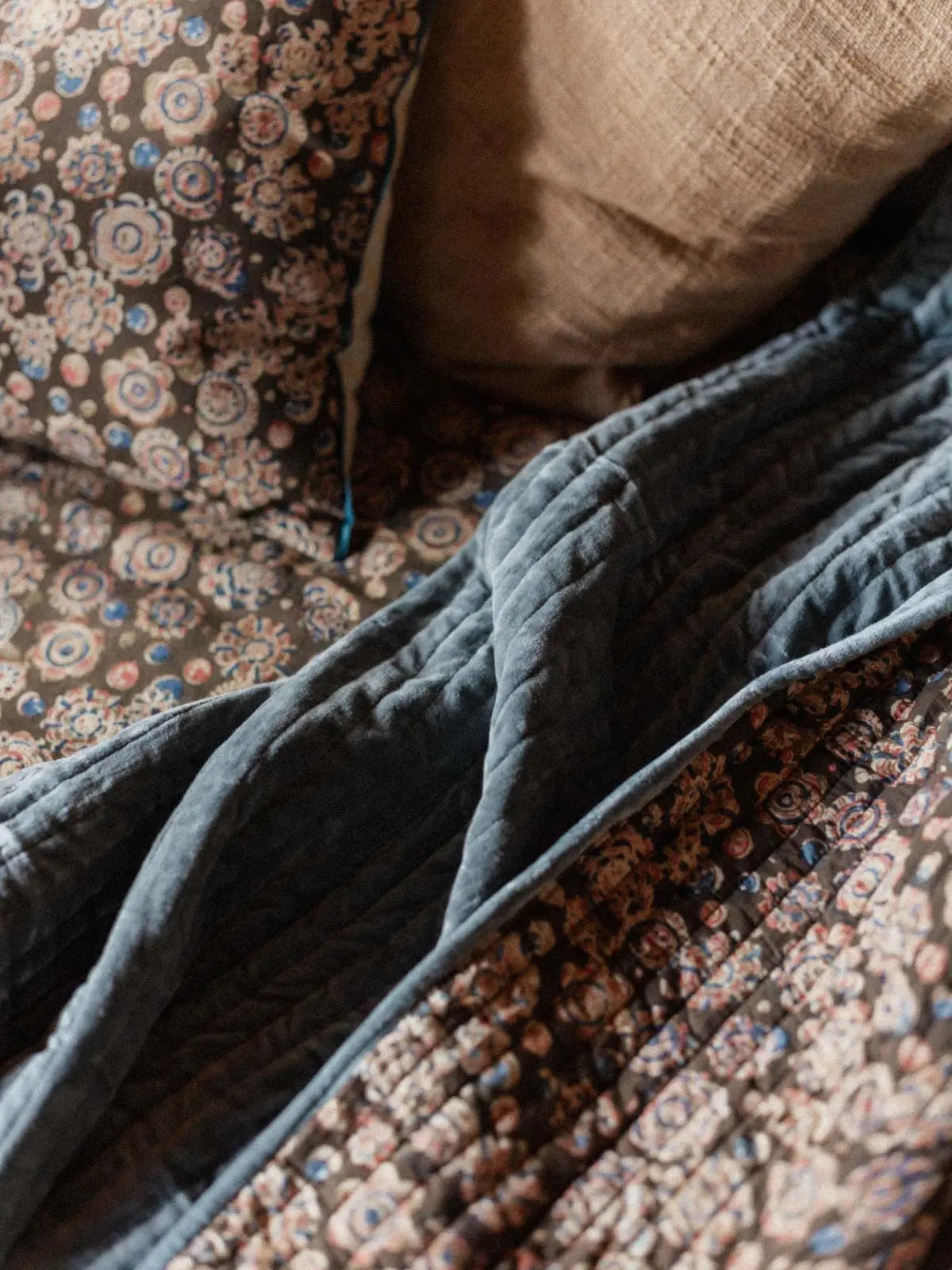 Ce plaid a une face en velours et une face en Block Print imprimée à la main. L’intérieur est rempli de ouatine pour plus de confort. Surpiqué à la main, chaque pièce est fabriquée avec soin dans notre atelier à Jaipur.