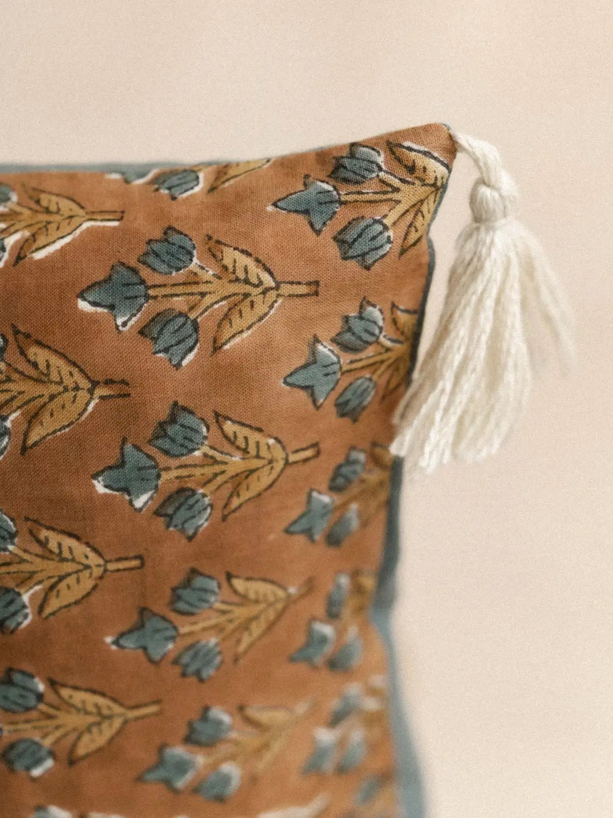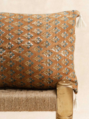 Dieser mit Leidenschaft gefertigte Kissenbezug verfügt über einen handgefertigten Druck mit mediterranen und orientalischen Einflüssen. Die sorgfältigen Details fallen sofort ins Auge: ein eleganter Geldbörsenverschluss und ockerfarbene Pompons, die einen warmen und trendigen Farbtupfer verleihen.