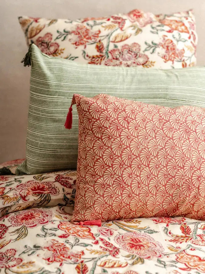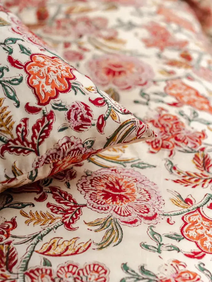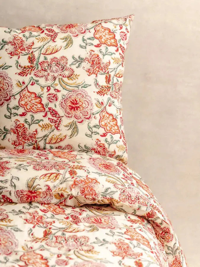 Despite its fineness, cotton voile is renowned for its strength and durability, ensuring a long-lasting quality for your bed linen. Additionally, its lightness and breathable properties make it an ideal choice for peaceful and comfortable nights. Each piece features a hand-applied pattern using the traditional block printing technique, adding a unique, artisanal touch to your home.