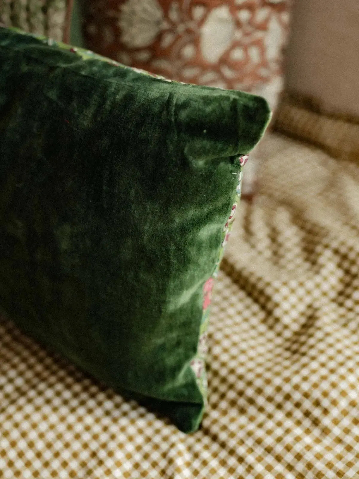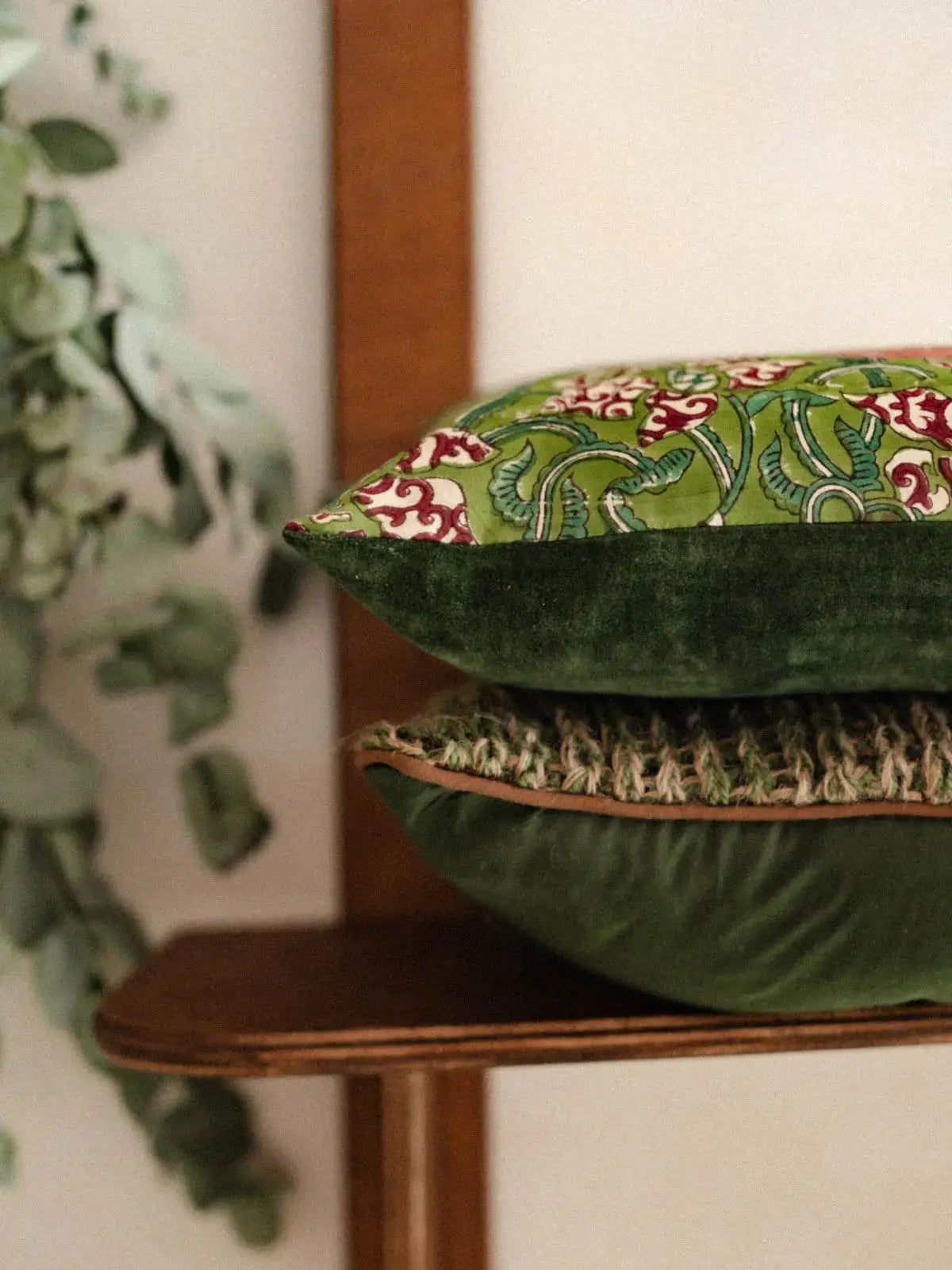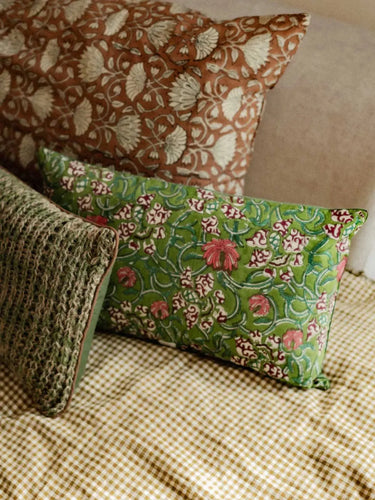 Discover this reversible cushion, combining a fir green velvet side with a hand-printed floral side, crafted using the block printing technique. An accessory that blends softness, freshness, and craftsmanship, offering both comfort and elegance.