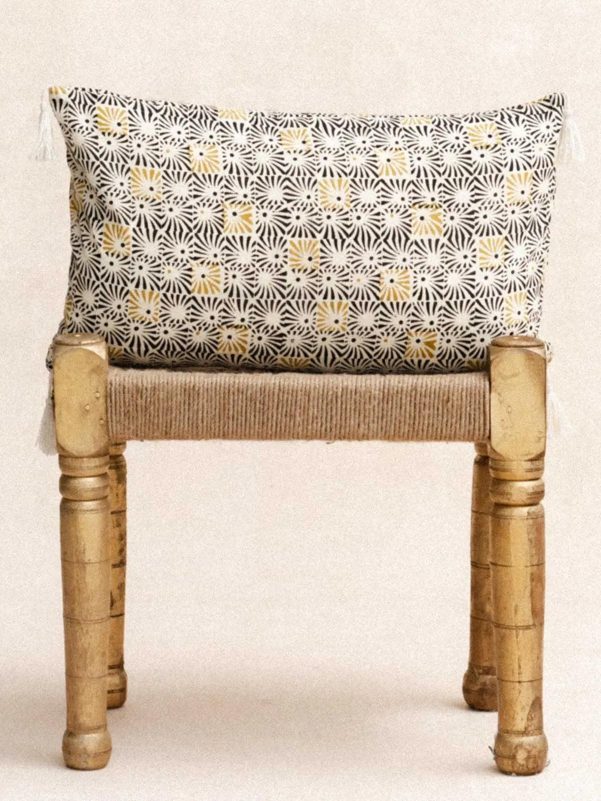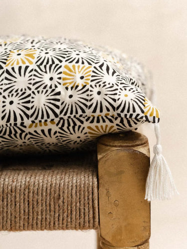 100% handcrafted cotton, printed using the age-old technique of Block Print. Each pattern tells a story of Indian tradition, crafted with meticulous precision by expert artisans. Delicately finished with cotton pompoms, entirely handmade. A living textile that embodies India's creative heritage, where every detail conveys elegance, craftsmanship and cultural authenticity.