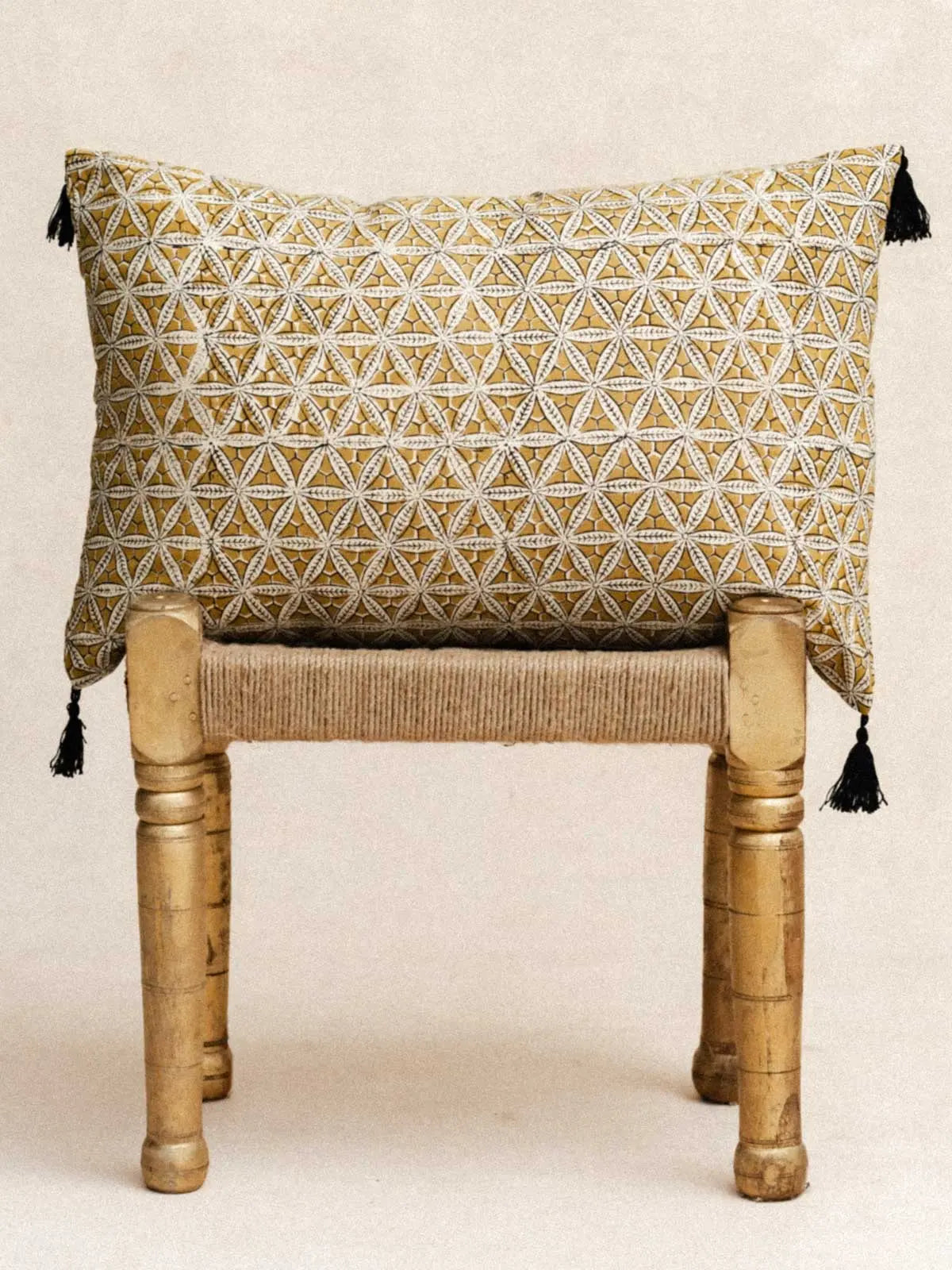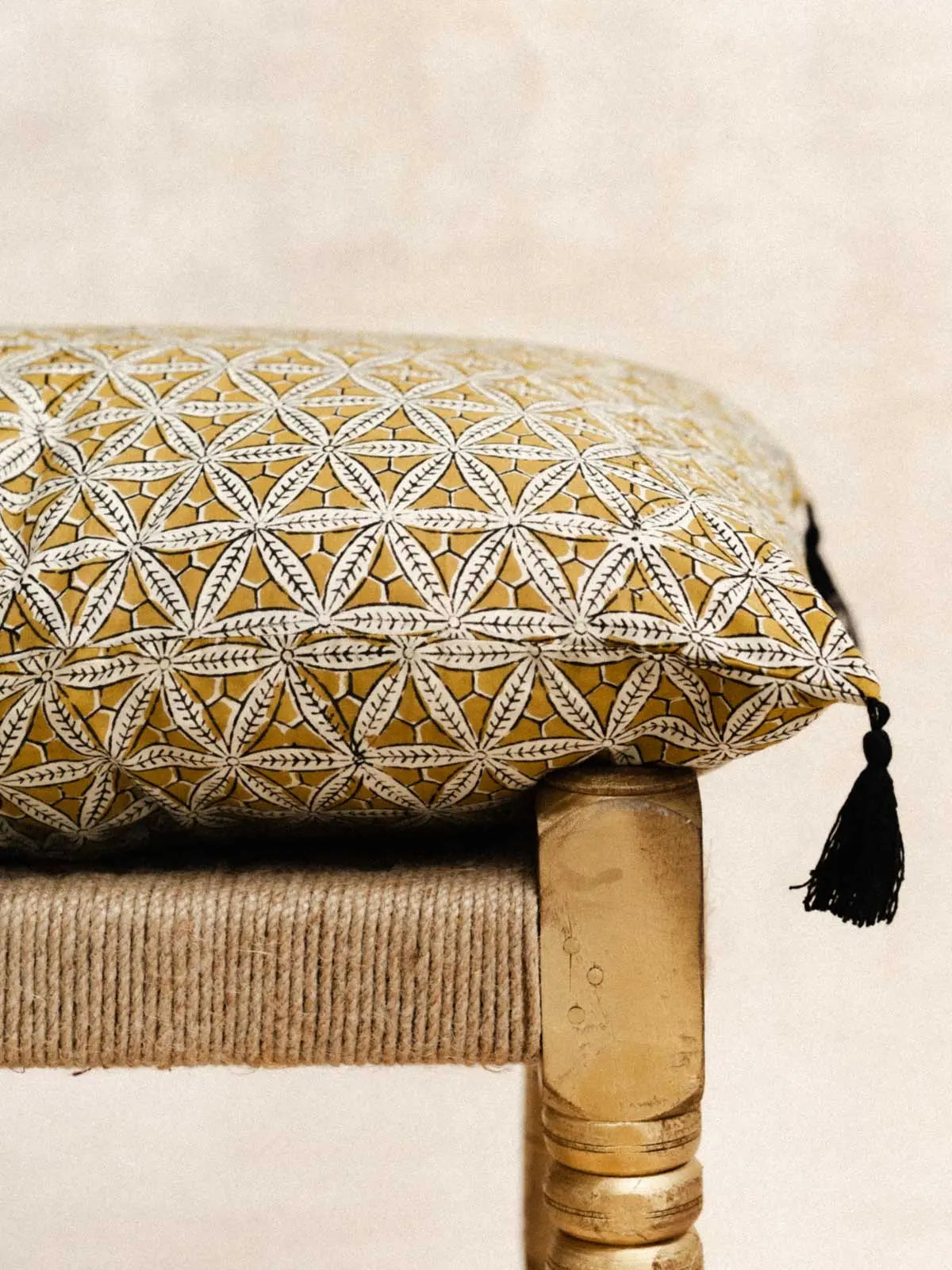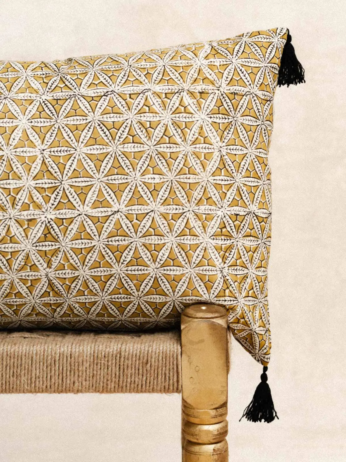 100% handcrafted cotton, printed using the age-old technique of Block Print. Each pattern tells a story of Indian tradition, crafted with meticulous precision by expert artisans. Delicately finished with cotton pompoms, entirely handmade. A living textile that embodies India's creative heritage, where every detail conveys elegance, craftsmanship and cultural authenticity.