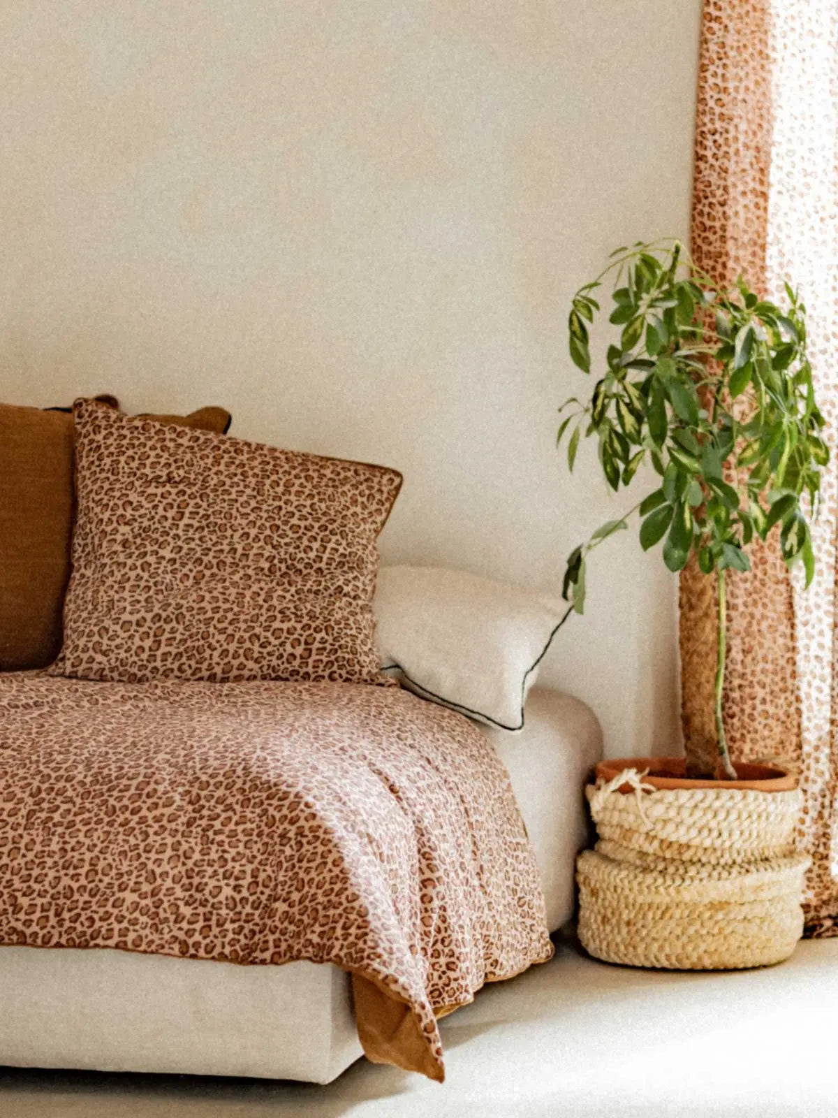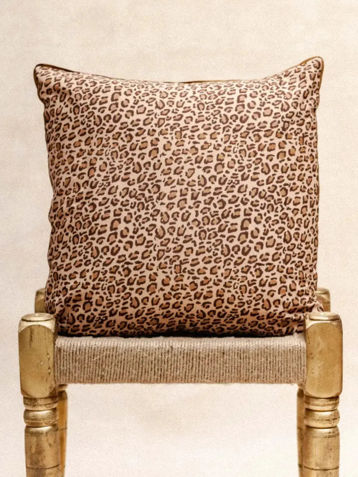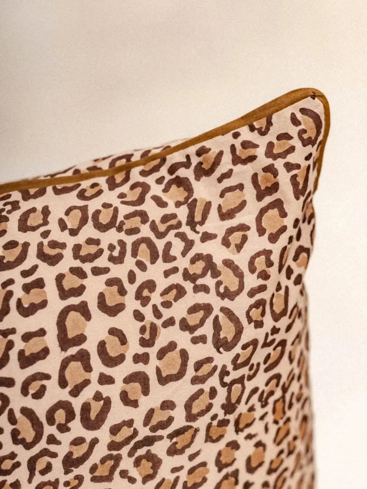 Size 45x45cm. Leopard print cushion cover, handmade using block printing. Carefully handcrafted, it embodies traditional craftsmanship and the finesse of artisanal work.
